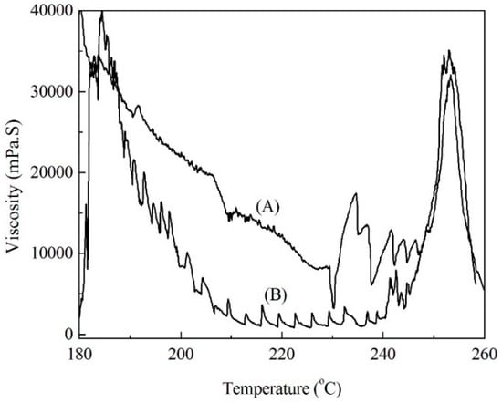 Changes in molten viscosity of modified soda lignin with the weight ratios of 1:3 (A) and 1:4 (B) with the increase of temperatures.