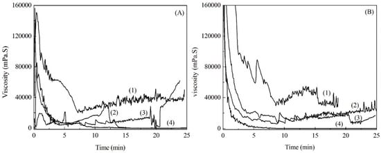 Molten viscosity of modified soda lignin with the weight ratios of 1:3 (A) and 1:4 (B) at selected temperatures. (Note: (1) 180 °C; (2) 190 °C; (3) 200 °C; and (4) 225 °C.)