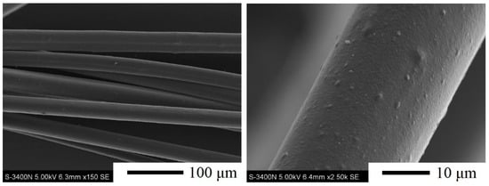 The surface morphology of soda lignin based fibers were observed using scanning electron microscopy (SEM; S-3400N, Hitachi Co. Ltd., Chiyoda, Tokyo, Japan) at magnifications of 150 to 2000 X and at an accelerating voltage of 5 kV. Before observation, the samples were coated with a thin layer by spraying gold metal using Ion Sputter (E-1010, Hitachi Co. Ltd., Chiyoda, Tokyo, Japan) before searching morphology. The average diameter of fiber was calculated from the individual measurement value of 30 filaments.