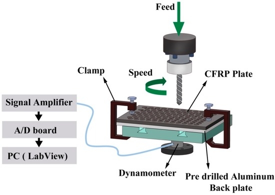 The dry-drilling experiments were performed using a vertical CNC milling machine (MiniMill, HAAS, Oxnard, CA, USA) with 7.5 horsepower. In order to mitigate the deflection and exit delamination of the CFRP workpiece, a pre-drilled aluminum fixture (hole diameter = 12.7 mm) was utilized in the experiments as a back plate. Figure 3 illustrates the schematic of the dry-drilling set up.