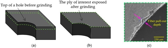 Destructive method of the fiber pull-out depth measurement process; (a) as-machined CFRP hole (the dotted line indicate the ply of interest); (b) a ground CFRP hole after grinding; and (c) a top view of the fiber pull-outs on the ground and polished CFRP hole observed in SEM.