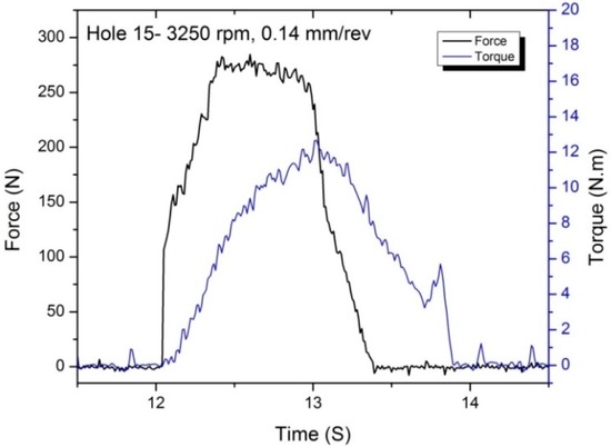Thrust and torque profiles of drilling a hole at 3250 rpm and 0.14 mm/rev.
