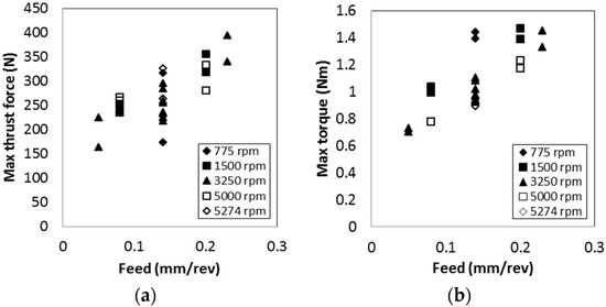 The effect of spindle speeds and feeds on maximum (a) thrust force and (b) torque.
