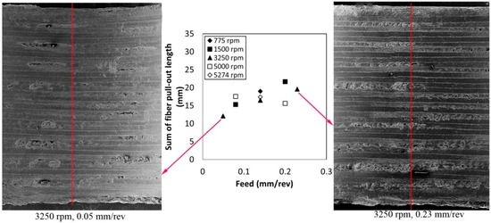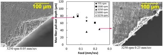 - An increase in the feed increased the fiber pull-out length. The maximum fiber pull-out depth, depending also on the drilling feed condition, ranged from 38–85 µm.