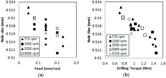 Effects of (a) feed and (b) maximum torque on the average hole size (drill diameter = 9.525 mm).