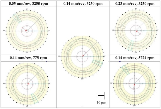 As shown in Figure 10, the roundness profiles at relatively high feed and high speed contains occasional deep valleys. This matches quite well with the fiber pull-out contour length introduced with the SEM pictures in Figure 7. The precision-roundness machine with a 1 mm diameter tip can capture the fiber pull-outs up to approximately 4 µm. Therefore, the location of fiber pull-outs can be detected by the precision-roundness machine while the fiber pull-out depth cannot be assessed effectively.