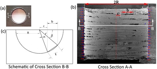 The projected length of each fiber pull-out, which is noted as “b” on Figure A1b, and its projected distance from the machined hole center, which is noted as “c”, are obtained from the SEM image using a commercially available image processing software (ImageJ ver. 1.48, NIH, Bethesda, MD, USA). Using Equations (A1)–(A3), the fiber pull-out angle (α), the fiber pull-out initiation angle (β), and the fiber pull-out length are calculated.