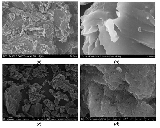 Scanning electron microscopy (SEM) images, shown in Figure 1, also illustrate the differences between the surface morphologies of the CSA and CSALA. Figure 1a,b show SEM images of the CSA, which exhibits a lamellar structure that is composed of polycyclic aromatic carbon sheets. The CSALA has a similar lamellar structure, but the sheets stack much more loosely. The CSALA carbon sheets are also smaller and have rougher surfaces than the CSA sheets. All of these differences are responsible for the porosity and increased specific surface area of the CSALA compared with the CSA.