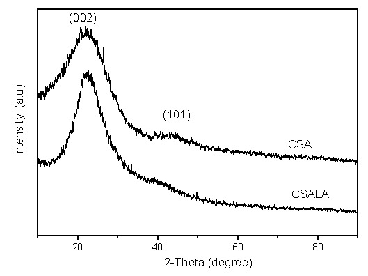 Figure 2 shows the XRD patterns of the CSA and CSALA. In both patterns, there is one broad diffraction peak at 2θ angles of 20°–30° (002), which reflects the stacking degree of aromatic carbon sheets [28], and one weak peak at 40°–50° (101), which is attributable to the α axis of the graphite structure [14]. The XRD results indicate that both the CSA and CSALA consist of disordered polycyclic aromatic carbon sheets. However, compared with that of the CSA, the (101) peak of the CSALA is almost non-existent. This corresponds to the smaller carbon sheets in the CSALA, and is consistent with the SEM results.