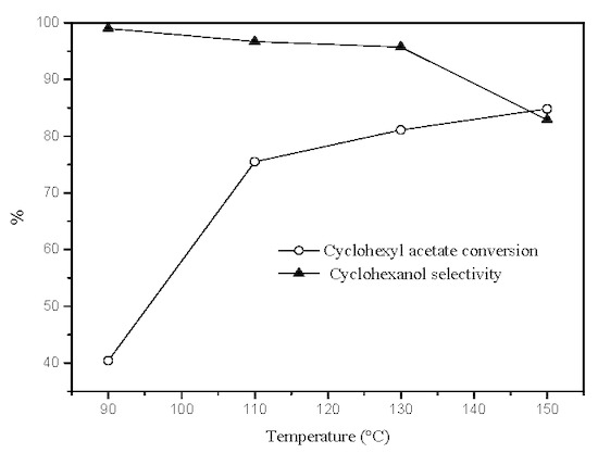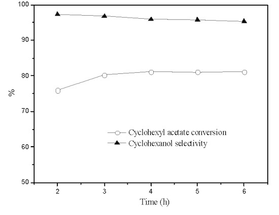 Figure 6 shows the effect of the reaction temperature on the hydrolysis of cyclohexyl acetate over CSALA catalyst. It can be seen that cyclohexyl acetate conversion increased rapidly from 40.4% to 75.5% with the reaction temperature increasing from 90 to 110 °C. With further increases of the reaction temperature, cyclohexyl acetate conversion slightly increased and reached 84.8% at 150 °C. However, selectivity to cyclohexanol decreased gradually from 99.0% to 95.9% with the temperature increasing from 90 to 130 °C. After that, it decreased rapidly to 82.8% at 150 °C, and the main side product was cyclohexene. This indicates that the pyrolysis of cyclohexyl acetate occurred to a greater extent at high temperatures.