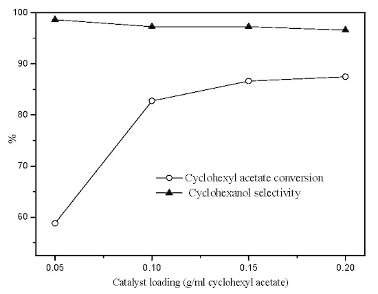 The effect of CSALA catalyst loading on the hydrolysis of cyclohexyl acetate was investigated, and the results are shown in Figure 8. Cyclohexyl acetate conversion initially increased, and then reached a plateau with increasing CSALA loading. When the catalyst loading was 0.15 g CSALA/mL cyclohexyl acetate, the conversion reached 86.6% with 97.3% cyclohexanol selectivity. However, the selectivity to cyclohexanol showed a slight monotonic decrease from 98.8% to 96.6% in the catalyst loading range investigated. This indicates that the pyrolysis of cyclohexyl acetate can also be accelerated by the CSALA and is more sensitive to catalyst loading. Under the same stirring conditions, too much catalyst would result in a low mass transfer coefficient; thus, a low reaction rate for the hydrolysis was obtained. However, pyrolysis of cyclohexyl acetate is a monomolecular reaction and is not greatly affected by diffusion.