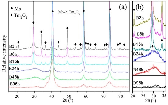 (a,b) X-ray patterns of Mo (21 wt %) Tm2O3 powder mixtures milled for different times at a 2θ of 15°–85° and 20°–36°, respectively.
