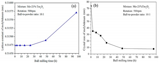 (a) Curve of the lattice parameter of Mo vs. ball-milling time; and (b) curve of the crystalline size of Mo vs. ball-milling time.
