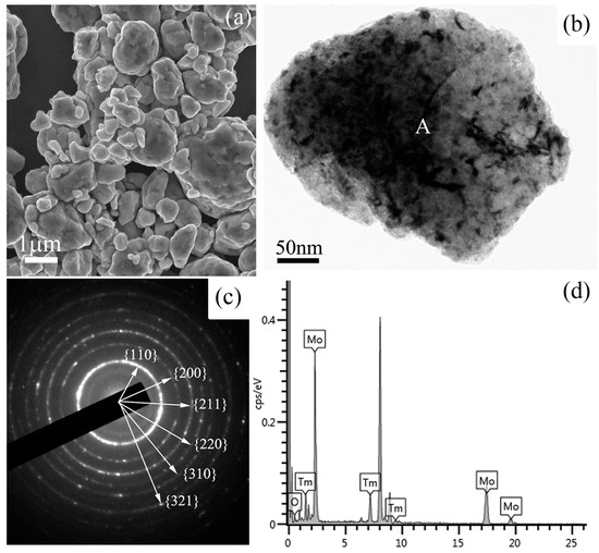 Figure 3 shows a SEM image, a bright field TEM image, the corresponding selected area electron diffraction (SAED) pattern, and the energy dispersive spectrometer (EDS) results of Mo (21 wt %) Tm2O3 powder mixtures milled for 48 h. The SEM image in Figure 3a shows the morphology of the ball-milled powder mixtures, which indicates that many particles with small size aggregate to form a large-size particle. The size of the particle is over one micrometer. A spherical particle with a size of approximately 500 nm can be observed in the TEM image. Some defects, such as dislocations, voids, and crystal boundaries can also be observed in this particle, which were induced by heavy deformation of powder mixtures during ball milling. These defects enhance the diffusivity of solute atoms into the Mo matrix. The SAED pattern taken from the region marked ‘A’ in Figure 3b is shown in Figure 3c. After analyzing and indexing the ring-shaped SAED pattern, it is indicated that this SAED pattern belongs to the Mo phase, not the Tm2O3 phase. Meanwhile, it is also demonstrated that the Mo component has already been nano-crystallized, which is also confirmed by the calculation results of Mo crystallites derived from Bragg diffraction peaks in Figure 1. Although the size of the particles is still at the micrometer scale, as shown in Figure 3a, the grain size is up to the nanometer scale. The EDS spectrum taken from the ball-milled particle is shown in Figure 3d, which includes Mo, O, and Tm element peaks. Similar EDS results are detected in other particles. Although the SAED results show that the particle belongs to a Mo crystal, Tm and O elements are also detected in this particle. Therefore, it indicates that Tm2O3 either uniformly distributes on the Mo particle surface in an amorphous form or dissolves into the Mo crystal structure in the form of Tm and O atoms. However, few diffraction halos related to the amorphous phase can be found in this SAED pattern, as show in Figure 3c, which indicates that Tm2O3 does not exist mainly in the amorphous form in this particle.
