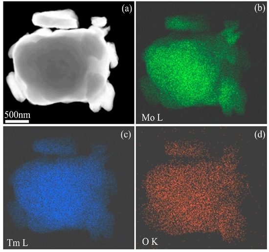 Figure 4a is a high angle annual dark field STEM image of Mo (21 wt %) Tm2O3 powder mixtures milled for 96 h, which shows several small particles agglomerated to form a large-sized particle. Figure 4b–d are Mo L, Tm L, and O K element mappings of the particles in Figure 4a, respectively. It can be seen that Mo, Tm, and O atoms are uniformly distributed in the particles. Every location contains Mo, Tm, and O elements, which further demonstrates that Tm2O3 dissolves into the Mo crystal structure after 96 h of ball milling because the diffraction hill indicating Tm2O3 amorphization disappears completely after 96 h of ball milling, as shown in Figure 1b.