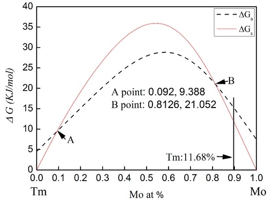 In addition, although the calculated Gibbs free energy of both the crystalline solid solution and the amorphous phase are higher than zero for all compositions, as shown in Figure 5, these calculated values are limitations and cannot completely represent actual situation. However, ball milling induced the decomposition of the Tm2O3 component, followed by solvation into the Mo crystal structure, the investigation of the Gibbs free energy using the Mo-Tm system to take the place of Mo-Tm2O3 system is also reasonable and feasible.