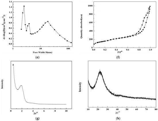 (a) SEM image of HPS; (b) SEM image of HPS; (c) TEM image HPS; (d) TEM image HPS; (e) Pore size distribution of HPS; (f) N2 adsorption/desorption isotherms of HPS; (g) Small-angle XRD of HPS; (h) Wide-angle XRD of HPS.