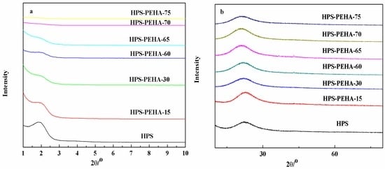 XRD profiles of HPS and HPS-PEHA-x adsorbents: (a) small-angle XRD of HPS and HPS-PEHA-x adsorbents; (b) wide-angle XRD of HPS and HPS-PEHA-x adsorbents.