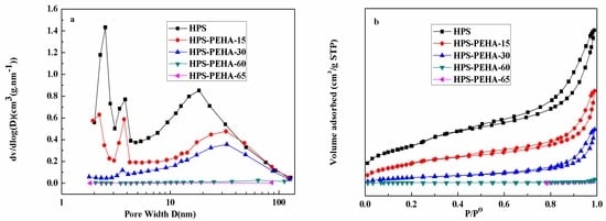 Figure 3 shows the pore size distributions and N2 adsorption/desorption isotherms of the adsorbents. The specific surface areas and pore volumes are listed in Table 1. With the increase of the PEHA amount, mesopores are filled while some macropores are maintained which is consistent with the results of average pore diameter (Table 1). When increasing the PEHA loading to 65%, the average pore diameter of the material increases to 23.90 nm. Although the N2 adsorption capacity decreases as the PEHA amount increases, the isotherms shape is similar, suggesting a decrease of the BET surface area and the pore volume e.g., BET surface area and pore volume of HPS are 544 m2/g and 1.00 cm3/g, respectively, which decrease to 302 m2/g and 0.6 cm3/g for PEHA loading of 15% and 2 m2/g and 0.00 cm3/g for PEHA loading of 65%, respectively.