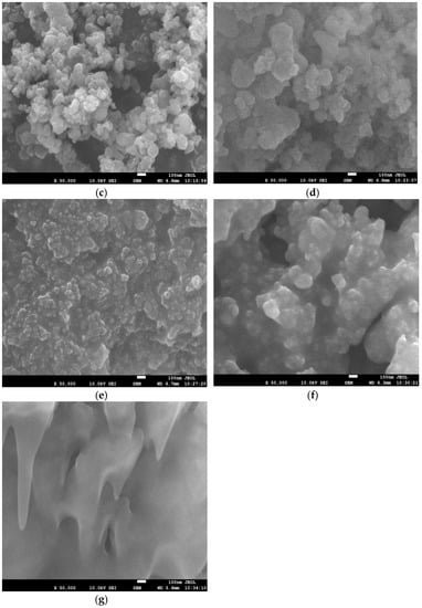 SEM images of of HPS and HPS-PEHA-x adsorbents: (a) HPS; (b) HPS-PEHA-15; (c) HPS-PEHA-30; (d) HPS-PEHA-60; (e) HPS-PEHA-65; (f) HPS-PEHA-70; (g) HPS-PEHA-75.