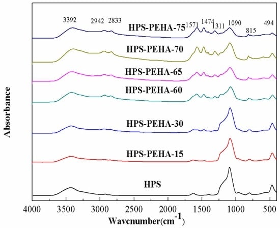 FT-IR spectra of the HPS and HPS-PEHA-x adsorbents.