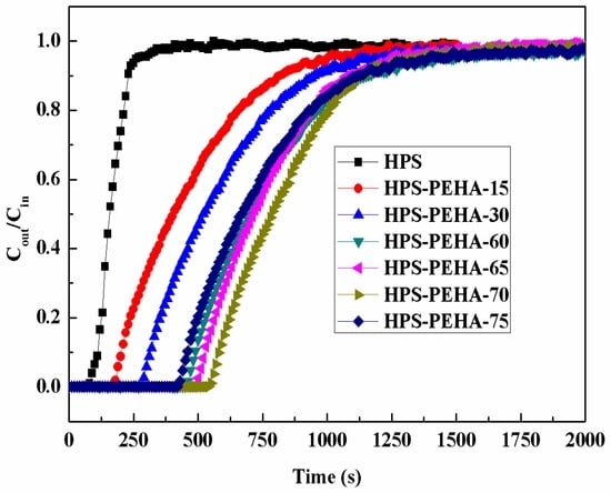 Breakthrough curves of CO2 against absorption time on HPS and HPS-PEHA-x adsorbents.