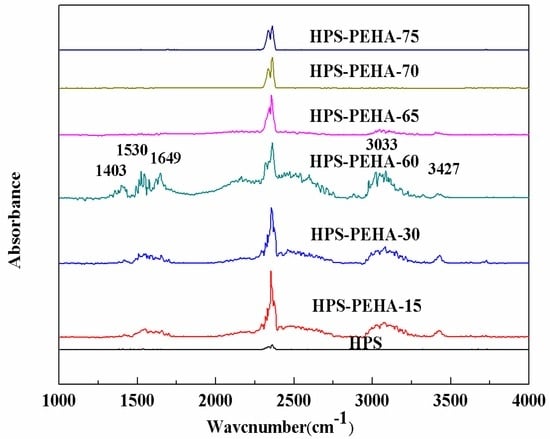 DRIFTS spectra of HPS and HPS-PEHA-x adsorbents.