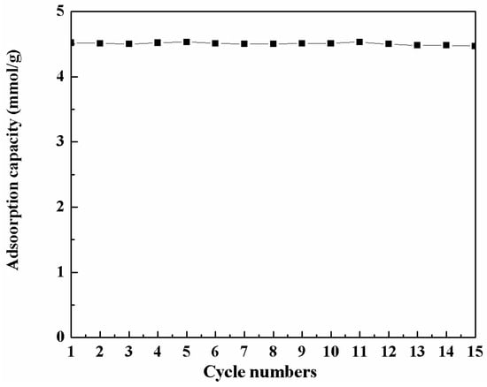 The CO2 adsorption capacities of HPS-PEHA-70 at temperatures ranging from 30–90 °C are displayed in Table 3. With the adsorption temperature increasing from 30 to 75 °C, the CO2 adsorption capacity increases from 3.2 to 4.5 mmol/g. Nevertheless, the CO2 adsorption capacity decreases significantly with further increased adsorption temperature. We can also introduce the two-amine-layer adsorption model (the inner bulky PEHA layer and the exposed PEHA layer) in the process of CO2 adsorption-desorption to analyze the impact [65,66]. At a relatively low temperature, the inner bulky PEHA layer plays the main role. The packed PEHA provides a low amine active site. However, as the temperature rises to 75 °C, the exposed PEHA layer plays a major role. High temperature causes organic amine stretching which leads to an increase in the number of exposed PEHA layers. This gives a good result in that amine sites and CO2 adsorption capacity increases. This can be explained well by the change CO2/N mole ratios. However, with further increase of the adsorption temperature, CO2 adsorption is mainly affected by the adsorption thermodynamics and CO2 desorption plays a dominant role. Consequently, the optimal temperature for CO2 adsorption thermodynamically and kinetically is 75 °C.