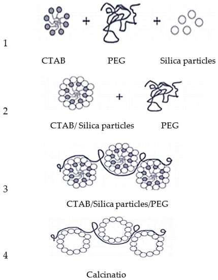 The general synthesis protocol for hierarchical porous silica (HPS) followed a sol-gel method by Smatt et al. [48]. Typically, tetraethoxysilane (TEOS, Sigma-Aldrich, St. Louis, MO, USA) was added to a mixture of poly(ethylene glycol) (PEG, Sigma-Aldrich, Mw 20,000, St. Louis, MO, USA) dissolved in HNO3 aqueous solution, and the sol was then stirred at 25 °C to form a clear solution. After that, cetyltrimethylammonium bromide (CTAB, Sinopharm chemical Reagent Co., Ltd., Shanghai, China) was added and stirred to completely dissolve the surfactant. The as-obtained sol was placed to form gel and further aged for 48 h at 40 °C. In order to obtain large textural pores, the gel was kept in 1 M NH4OH solution for 9 h at 90 °C. The crystals used 0.1 M HNO3 solution to acidify and were then washed with ethanol. Finally, the gel was dried at 60 °C for 3 days followed by calcination at 550 °C for 5 h to obtain the HPS.