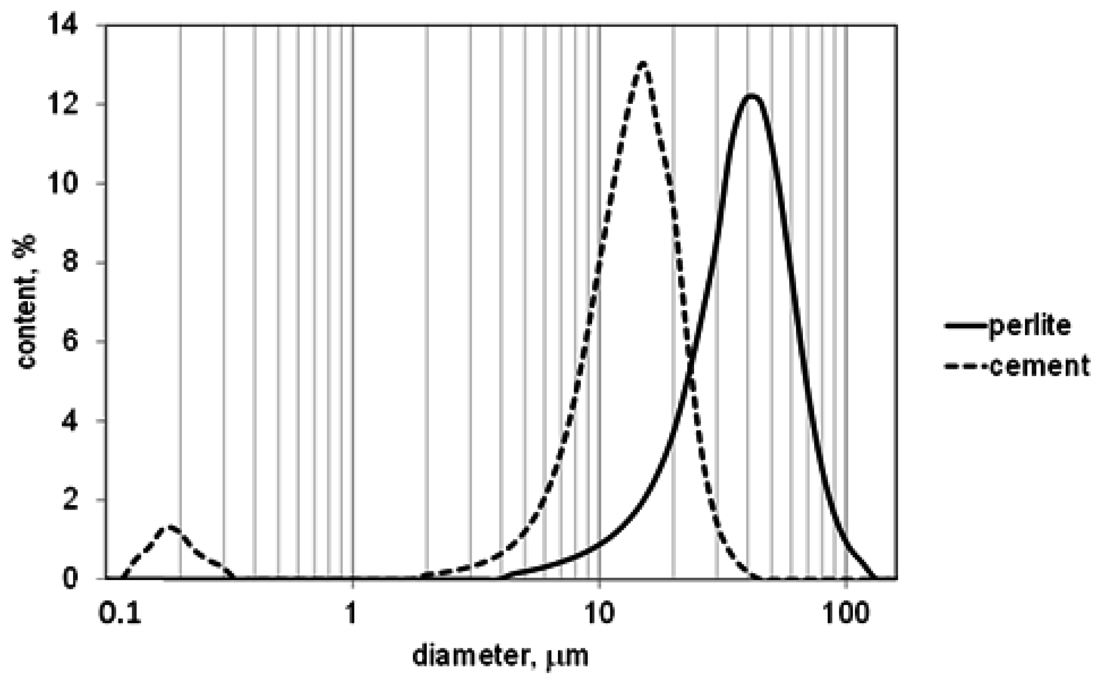 Grain size distribution of the waste perlite powder is presented in Figure 1 together with the grain size distribution of the Portland cement used in testing. The mean diameter of the grains of the waste perlite was 37 μm, and 90% of the grains had a diameter (D90) below 59 μm. The mean diameter of the grains of the cement was 13 μm, and 90% of the grains had a diameter (D90) below 22 μm.