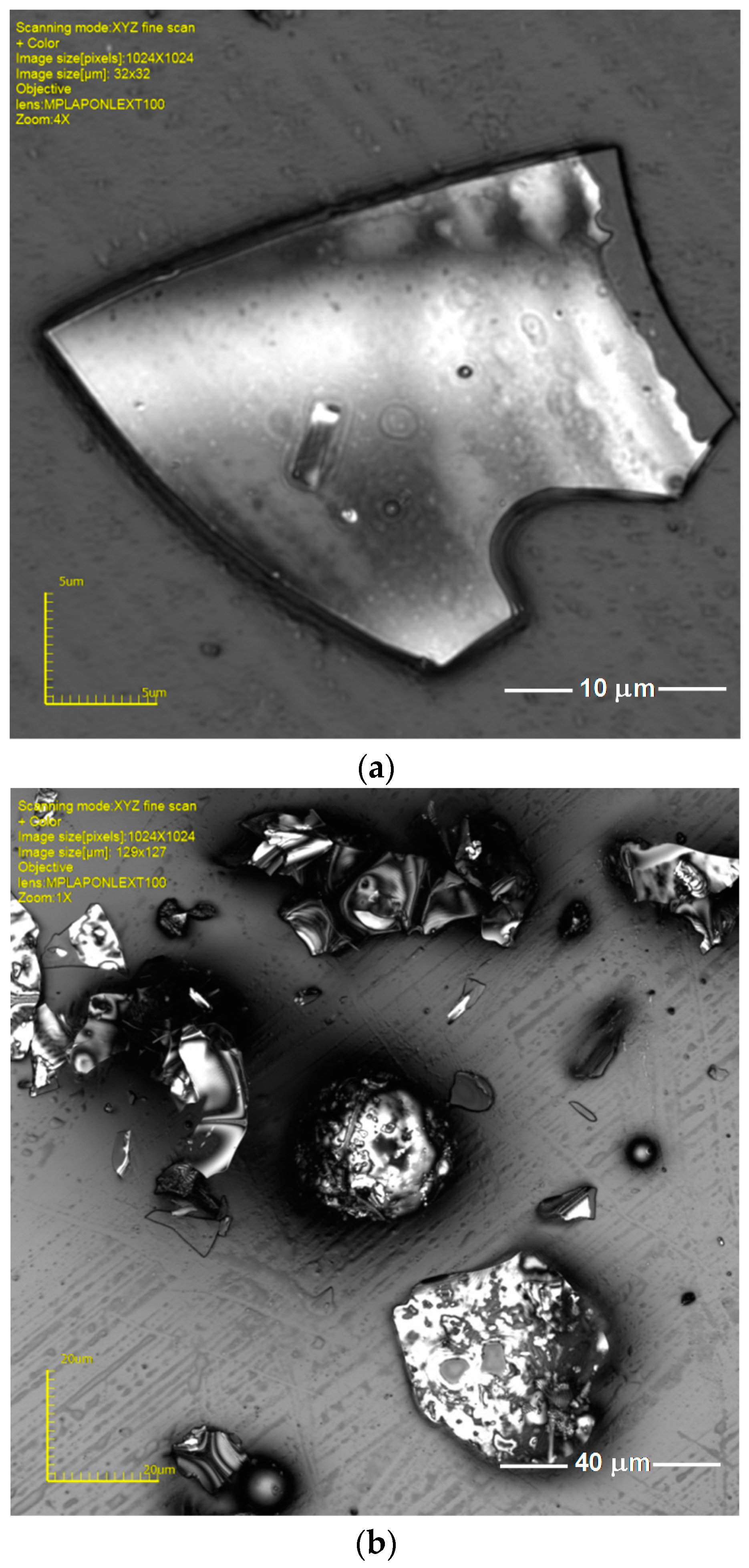 Typical shapes of the waste perlite powder grains; images from a laser optical microscope. (a) Single flat particle; (b) particles of irregular shapes.