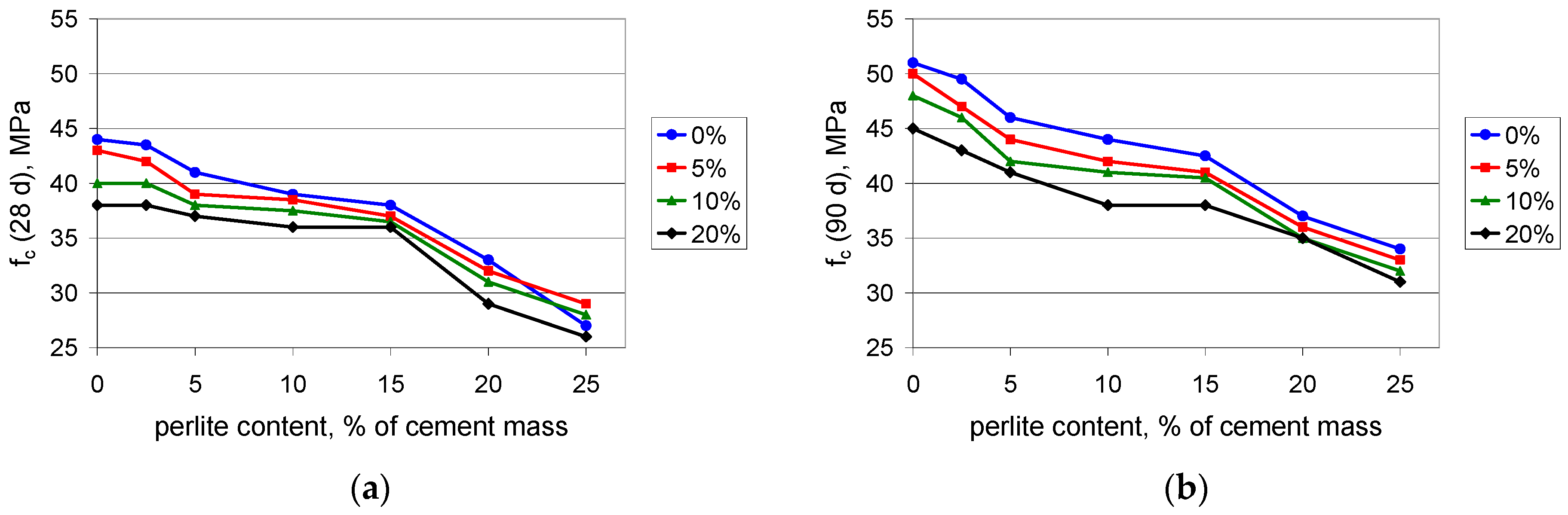 Compressive strength of mortars with polymer content values of 0%, 5%, 10%, and 20% of cement mass vs. waste perlite content: (a) after 28 days; (b) after 90 days of curing.