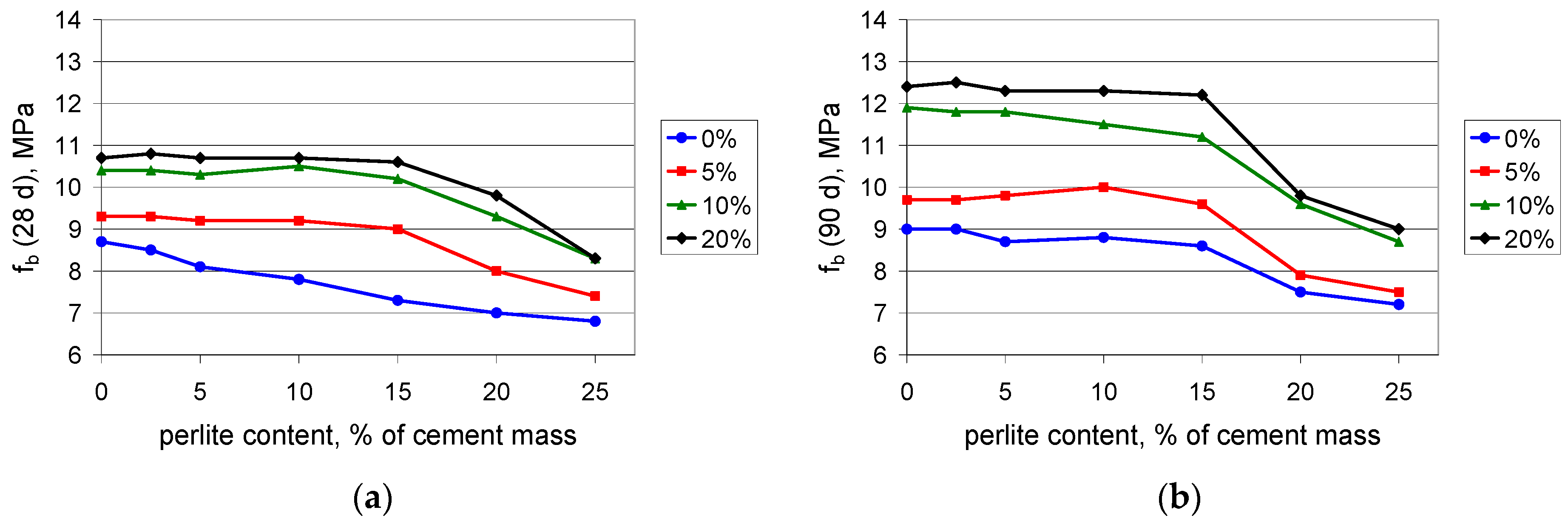 Flexural strength of mortars with polymer content values of 0%, 5%, 10%, and 20% of cement mass vs. waste perlite content: (a) after 28 days; (b) after 90 days of curing.