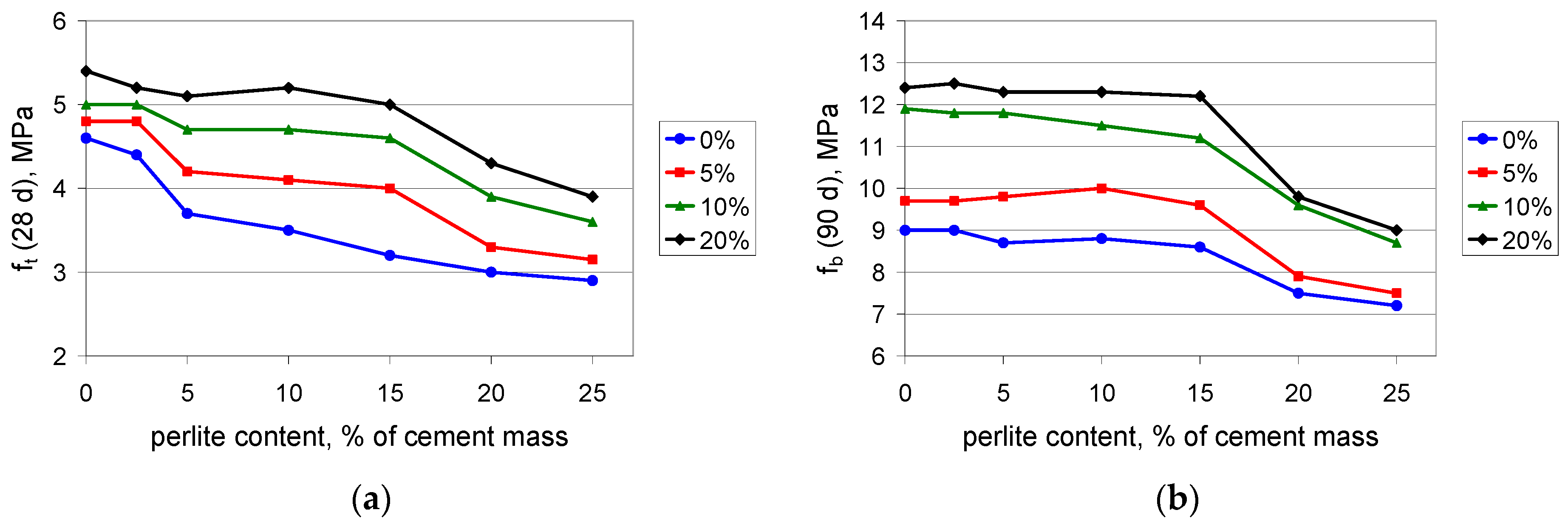 Tensile strength of mortars with polymer content values of 0%, 5%, 10%, and 20% of cement mass vs. waste perlite content: (a) after 28 days; (b) after 90 days of curing.