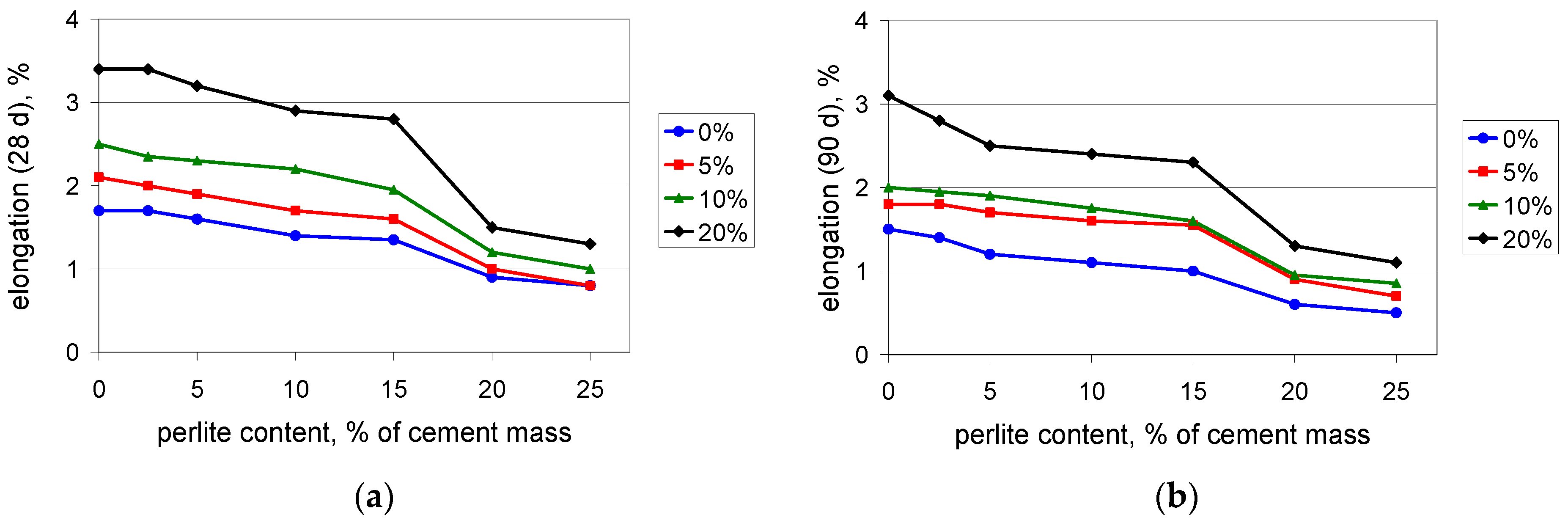 Flexural and tensile strength increases when polymer is added to the composite. This is in perfect agreement with the expectations, since the polymer modifier is expected to improve these properties [37]. The test results confirm the observation from the compressive strength determination: when the content value of the perlite waste is up to 15%, the performance of the composite is rather moderate. At 15%, the waste perlite causes a reduction in the 28-day flexural strength (Figure 4a) by no more than 3%, except in the case of 20% of polymer, where the reduction reaches 15%. A larger amount of powder worsens the mechanical properties. When the content value of the perlite waste is 20%, the reduction of the 28-day flexural strength is 15%–20%. The 90-day flexural strength (Figure 4b) is reduced by no more than 5% when the content value of the waste perlite is 15%, while at a content value of 20% the reduction exceeds 20%. A similar situation can be observed for the tensile strength (Figure 5). The same conclusion can be drawn from the results of the testing of the maximum elongation at tension. The elongation after 90 days (Figure 6b) is somewhat lower than that after 28 days (Figure 6a), which shows that the composite containing the waste perlite powder becomes more brittle with time.