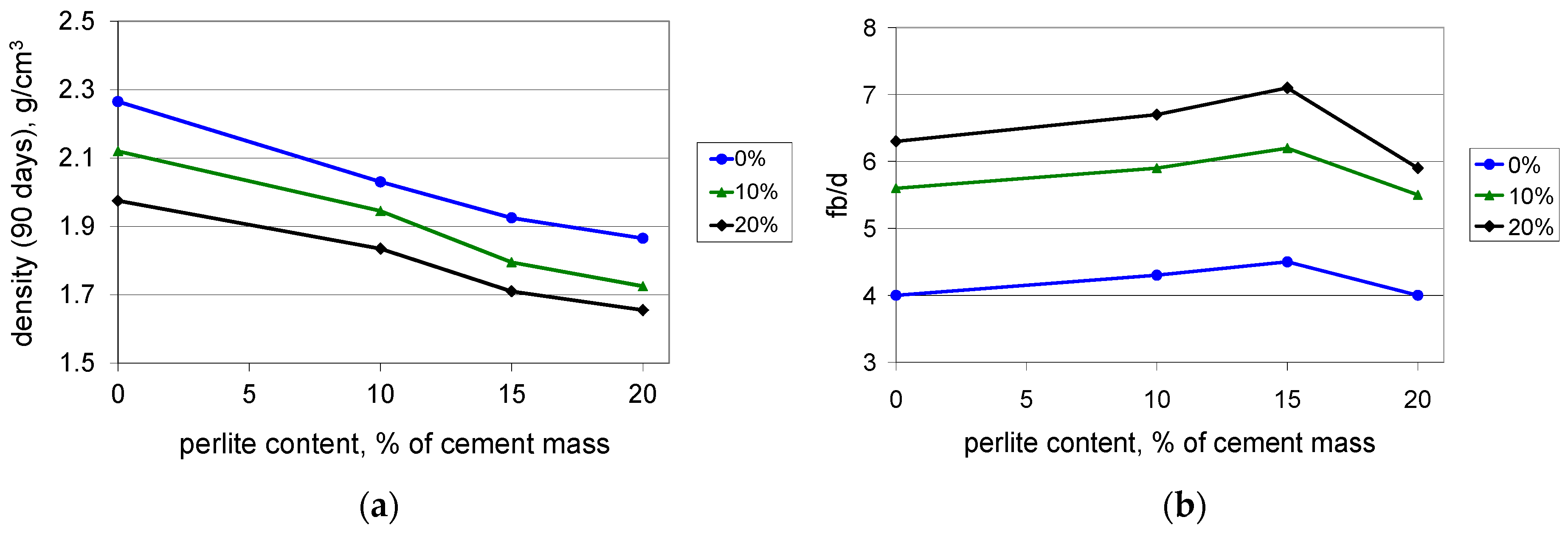 Density (a) and flexural strength to density ratio (b) of the mortars with polymer content values of 0%, 10%, and 20% of cement mass vs. waste perlite content after 90 days of curing.