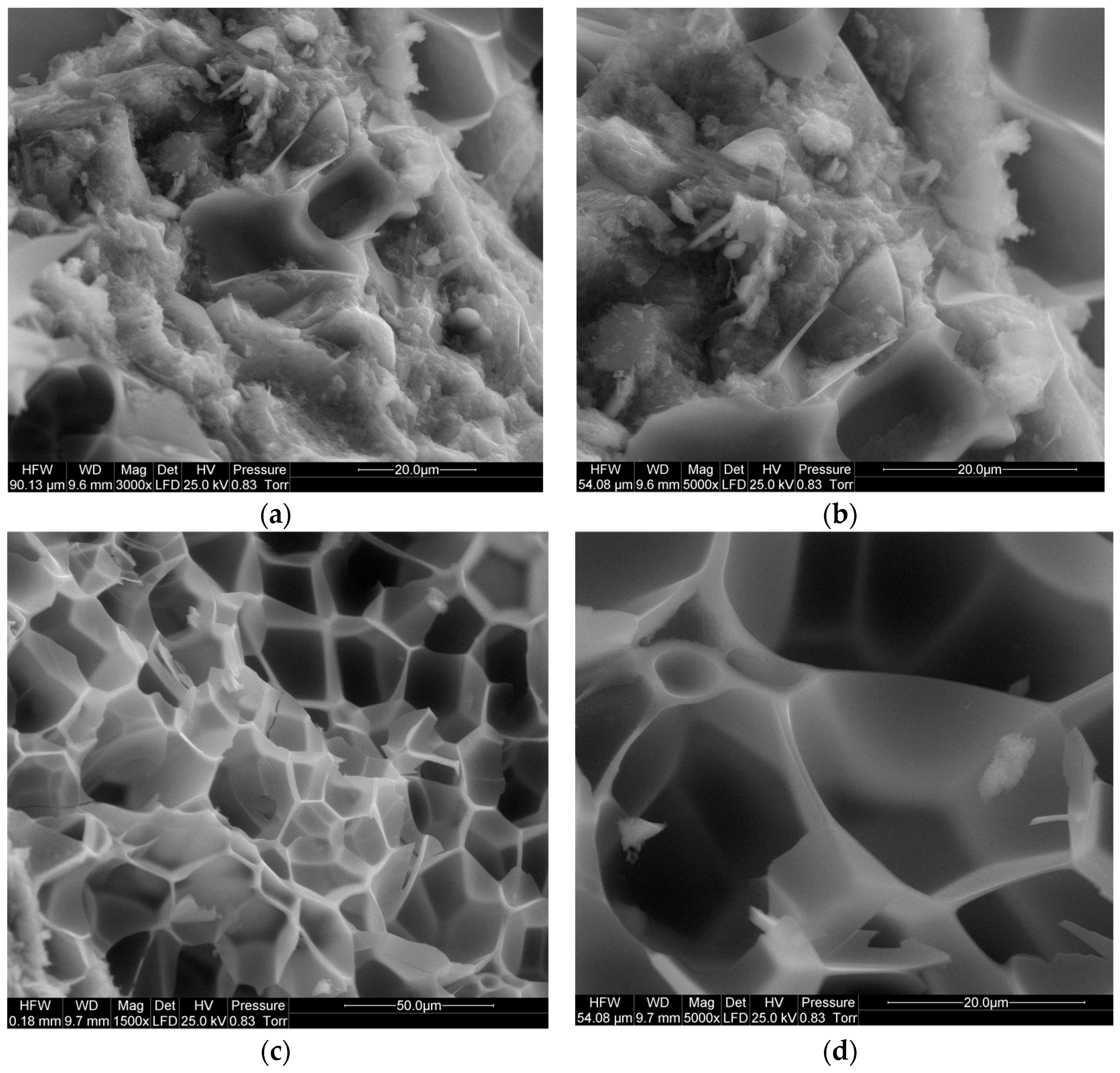 Microstructure of polymer-cement paste containing waste perlite powder; content values of the additions (in relation to cement mass): perlite 15%, polymer 20%. (a) polymer-cement interpenetrating network; (b) closer look to polymer-cement network; (c) polymer network; (d) detail of polymer network with embedded particles of perlite powder.