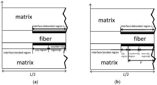 The schematic figure for fiber slipping relative to matrix upon: (a) unloading; and (b) reloading [18].