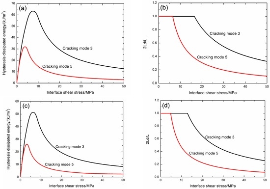 When σmax = 200 MPa, the fatigue hysteresis dissipated energy and interface debonded length 2Ld/L versus interface shear stress curves of matrix cracking mode 3 and mode 5 are illustrated in Figure 4c,d. For matrix cracking mode 3, the hysteresis dissipated energy increases with decreasing interface shear stress from 18.2 kJ/m3 at the interface shear stress of 50 MPa to the peak value of 76.7 kJ/m3 at the interface shear stress of 9.2 MPa, and decreases to 0 kJ/m3 at the interface shear stress of 0 MPa, as shown in Figure 4c; and the interface debonded length 2Ld/L increases with decreasing interface shear stress from 0.47 at the interface shear stress of 50 MPa to the peak value of 1.0 at the interface shear stress of 23.7 MPa, and remains to be constant of 1.0 until the interface shear stress of 0 MPa, as shown in Figure 4d. For matrix cracking mode 5, the hysteresis dissipated energy increases with decreasing interface shear stress from 4.5 kJ/m3 at the interface shear stress of 50 MPa to the peak value of 39.5 kJ/m3 at the interface shear stress of 4.7 MPa, and decreases to 0 kJ/m3 at the interface shear stress of 0 MPa, as shown in Figure 4c; and the interface debonded length 2Ld/L increases with decreasing interface shear stress from 0.17 at the interface shear stress of 50 MPa to the peak value of 1.0 at the interface shear stress of 10 MPa, and remains to be constant of 1.0 until the interface shear stress of 0 MPa, as shown in Figure 4d.