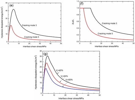 When the fiber volume fraction is 50%, the fatigue hysteresis dissipated energy and interface debonded length 2Ld/L versus interface shear stress curves of matrix cracking mode 3 and mode 5 are illustrated in Figure 3e,f. For matrix cracking mode 3, the hysteresis dissipated energy increases with decreasing interface shear stress from 5.5 kJ/m3 at the interface shear stress of 50 MPa to the peak value of 41.8 kJ/m3 at the interface shear stress of 5 MPa, and decreases to 0 kJ/m3 at the interface shear stress of 0 MPa, as shown in Figure 3e; and the interface debonded length 2Ld/L increases with decreasing interface shear stress from 0.19 at the interface shear stress of 50 MPa to the peak value of 1.0 at the interface shear stress of 9.9 MPa, and remains to be constant of 1.0 until the interface shear stress of 0 MPa, as shown in Figure 3f. For matrix cracking mode 5, the hysteresis dissipated energy increases with decreasing interface shear stress from 1.8 kJ/m3 at the interface shear stress of 50 MPa to the peak value of 21.2 kJ/m3 at the interface shear stress of 2.5 MPa, and decreases to 0 kJ/m3 at the interface shear stress of 0 MPa, as shown in Figure 3e; and the interface debonded length 2Ld/L increases with decreasing interface shear stress from 0.05 at the interface shear stress of 50 MPa to the peak value of 1.0 at the interface shear stress of 3.4 MPa, and remains to be constant of 1.0 until the interface shear stress of 0 MPa, as shown in Figure 3f.