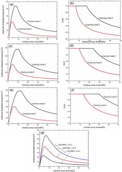 (a) The hysteresis dissipated energy versus interface shear stress curves of matrix cracking mode 3 and mode 5 when σmax = 150 MPa; (b) the interface debonded length 2Ld/L versus interface shear stress curves of matrix cracking mode 3 and mode 5 when σmax = 150 MPa; (c) the hysteresis dissipated energy versus interface shear stress curves of matrix cracking mode 3 and mode 5 when σmax = 200 MPa; (d) the interface debonded length 2Ld/L versus interface shear stress curves of matrix cracking mode 3 and mode 5 when σmax = 200 MPa; (e) the hysteresis dissipated energy versus interface shear stress curves of matrix cracking mode 3 and mode 5 when σmax = 250 MPa; (f) the interface debonded length 2Ld/L versus interface shear stress curves of matrix cracking mode 3 and mode 5 when σmax = 250 MPa; and (g) the composite hysteresis dissipated energy versus interface shear stress curves when σmax = 150, 200 and 250 MPa, and η = 0.2.