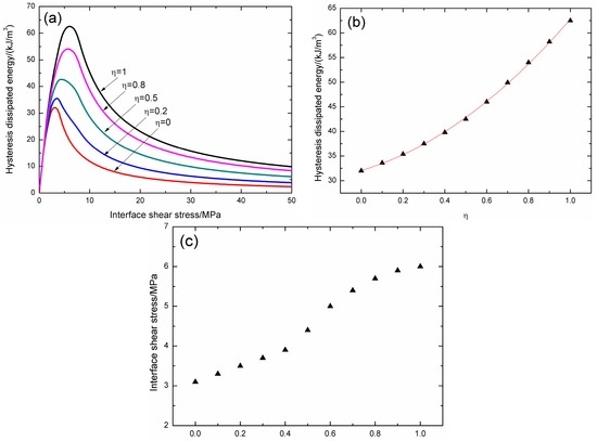 Effect matrix cracking mode proportion, i.e., η = 0, 0.2, 0.5, 0.8 and 1.0, on (a) the hysteresis dissipated energy versus interface shear stress curve; (b) the peak value of composite hysteresis dissipated energy versus η curve; and (c) the corresponding interface shear stress versus η curve.