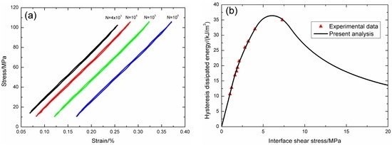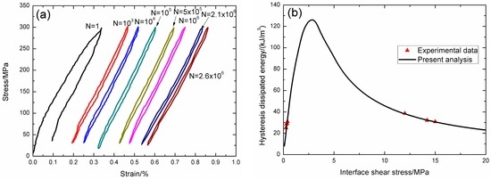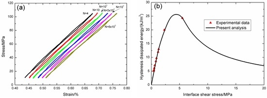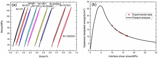 (a) The experimental fatigue hysteresis loops corresponding to different cycle number; and (b) the experimental and theoretical fatigue hysteresis dissipated energy versus interface shear stress curve of cross-ply C/SiC composite under σmax = 105 MPa at 800 °C in air.