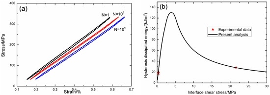 Under fatigue peak stress of σmax = 335 MPa, the fatigue hysteresis loops corresponding to different applied cycles are illustrated in Figure 7a, in which the proportion of matrix cracking mode 3 is η = 0.2. The experimental and theoretical fatigue hysteresis dissipated energy as a function of interface shear stress is shown in Figure 7b. The theoretical fatigue hysteresis dissipated energy increases with decreasing interface shear stress to the peak value of 130.4 kJ/m3, and decreases with decreasing interface shear stress to 0 kJ/m3. The experimental fatigue hysteresis dissipated energy of the 1st cycle lies in the right part of the fatigue hysteresis dissipated energy versus interface shear stress curve. The fatigue hysteresis loop of the 1st cycle corresponds to interface slip Case 2, i.e., interface partially debonds, and fiber slides partially relative to matrix in the interface debonded region. With the number of applied cycles increasing, interface shear stress decreases with increasing cycle number due to interface wear. By comparing experimental fatigue hysteresis dissipated energy with theoretical values, the interface shear stress corresponding to different applied cycles can be estimated, as shown in Table 2. The fatigue hysteresis loops of the 1000th and 1,000,000th applied cycle correspond to interface slip Case 4, i.e., interface completely debonds and fiber slides completely relative to matrix in the interface debonded region.