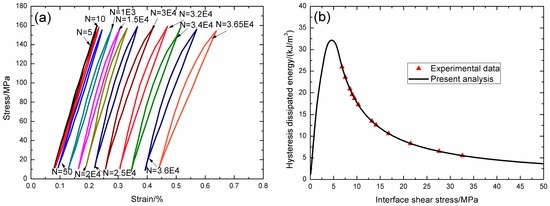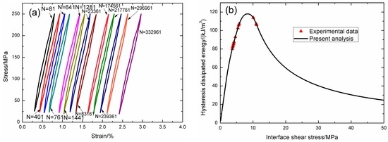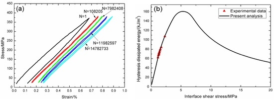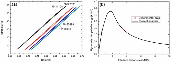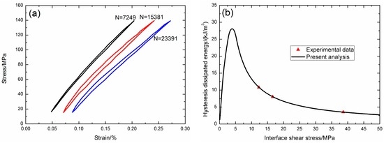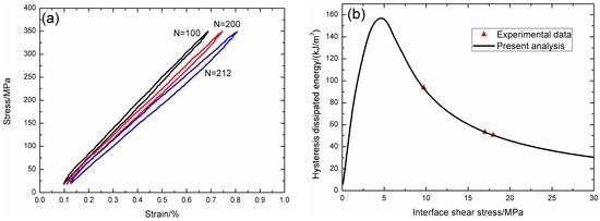 Under fatigue peak stress of σmax = 375 MPa, the fatigue hysteresis loops corresponding to different applied cycles are illustrated in Figure 8a, in which the proportion of matrix cracking mode 3 is η = 0.2. The experimental and theoretical fatigue hysteresis dissipated energy as a function of interface shear stress is shown in Figure 8b. The theoretical fatigue hysteresis dissipated energy increases with decreasing interface shear stress to the peak value of 160.7 kJ/m3, and then decreases with decreasing interface shear stress to 0 kJ/m3. The experimental fatigue hysteresis dissipated energy of the 2nd cycle lies in the left part of the fatigue hysteresis dissipated energy versus interface shear stress curve. The fatigue hysteresis loop of the 2nd cycle corresponds to interface slip Case 4, i.e., the interface completely debonds, and fiber slips completely relative to matrix in the interface debonded region. By comparing experimental fatigue hysteresis dissipated energy with theoretical values, the interface shear stress corresponding to different applied cycles can be estimated, as shown in Table 3.