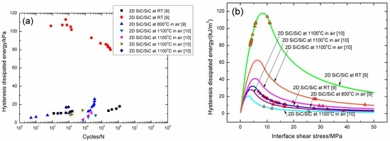 By comparing experimental fatigue hysteresis dissipated energy with theoretical computational values, the interface shear stress of CMCs can be obtained [21]. The degradation rate ψ of interface shear stress can be determined by the Equation (11).