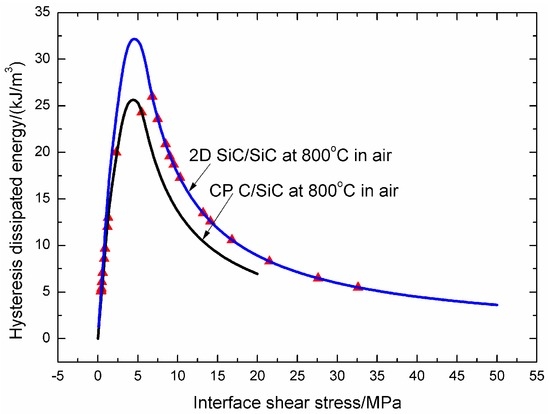 The experimental fatigue hysteresis dissipated energy versus cycle number curves of cross-ply and 2D woven C/SiC composites at room temperature, 550 °C, and 800 °C in air, and 1200 °C in vacuum are illustrated in Figure 17a. For cross-ply C/SiC composite under σmax = 105 MPa at room temperature and 800 °C in air, 2D woven C/SiC composite under σmax = 335 and 375 MPa at room temperature, the experimental fatigue hysteresis dissipated energy decreases with increasing cycle number, and lies in the right and left part of the fatigue hysteresis dissipated energy versus interface shear stress curve, as shown in Figure 17b. For 2D woven C/SiC composite under σmax = 350 MPa at 550 °C in air, the experimental fatigue hysteresis dissipated energy increases with increasing cycle number, and lies in the right part of the fatigue hysteresis dissipated energy versus interface shear stress curve, as shown in Figure 17b. For 2D woven C/SiC composite under σmax = 57 MPa at room temperature, and σmax = 300 MPa at 1200 °C in vacuum, the experimental fatigue hysteresis dissipated energy increases first, and then decreases with increasing cycle number, and lies in the right and left part of the fatigue hysteresis dissipated energy versus interface shear stress curve, as shown in Figure 17b.