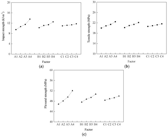 The range analysis method is based on calculating the range (R value) of each column in the orthogonal Table 2 through statistical methods. This method can be used to determine the major and minor orders between the processing parameters, in order to obtain the optimum combination of levels. For determining the optimum combination, we assumed that a greater range corresponds to a factor with a greater impact. When constructing the optimum combination of levels, the δ values determine the pros and cons of each factor. The calculation results are listed in Table 3. With respect to the impact strength of the prepared WPCs, the R value corresponding to the steam temperature, steam pressure, and processing time are 4.08, 1.42, and 0.18, respectively. Clearly, the R value corresponding to the steam temperature is the maximum, and it is the minimum for the processing time, and the results were consistent with those of the tensile and flexural strength of the prepared WPCs. Thus, the following major and minor relationships between the processing parameters and the mechanical properties of the prepared WPCs exit: the steam temperature (A) is predicted to have the strongest effect; the steam pressure (B) has the second-strongest effect; and the processing time (C) has the weakest effect on the mechanical properties.