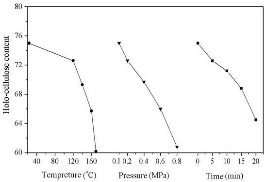 Figure 2 shows the hollocellulose content of wood fibers as a function of steam temperature, pressure, and retention time. The hollocellulose content of the wood fibers was found to decrease with increasing temperature and pressure because the high-temperature and high-pressure steam could remove the acetyl group of the semi-cellulose and induce the formation of acetic acid. Under the resulting acidic conditions, the glycoside bond breaks and a more thorough degradation occurs, whereas the lignin only experiences a slight softening rather than degradation due to its higher thermal stability.