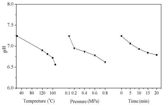 The results of pH of wood fibers under various steam treatments are shown in Figure 3. The pH of untreated wood fibers (control sample) was 7.25. After high temperature and pressurized steam treatments, the pH of wood fibers decreased remarkably. The pH of the treated fibers under 160 °C for 15 min was reduced to 6.5 from 7.25 of the control sample. Moreover, the pH of the fibers decreased with increasing temperature, pressure, and retention time of the treatment. This result indicated that the acidic properties of wood fibers increased after steam treatment. It was also observed that the color of the modified fibers became more intense [33]. During the treatment, the semi-cellulose with its comparatively poor heat resistance partially degrades, losing its acetyl group, resulting in the formation of acetic acid. During the modification process, an increase in either temperature, pressure, or processing time leads to the generation of a higher amount of acidic substances and, thereby, a higher acidity.